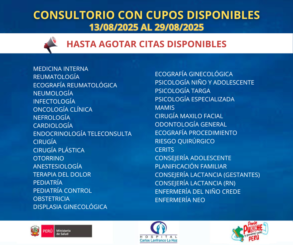 📢 Estimados usuarios le compartimos el listado actualizado de especialidades que tienen cupo para atención del 13 al 29 de agosto.