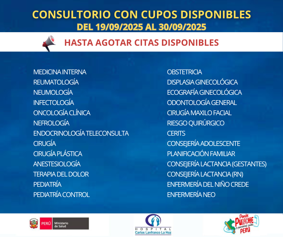 | 📢 Estimados usuarios le compartimos el listado actualizado de especialidades que tienen cupo para atención del 19 al 30 de setiembre. |