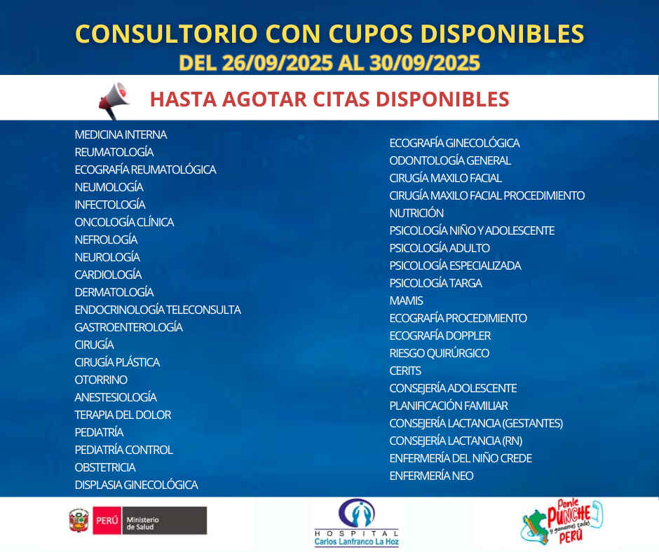 | 📢 Estimados usuarios le compartimos el listado actualizado de especialidades que tienen cupo para atención del 26 al 30 de setiembre. |