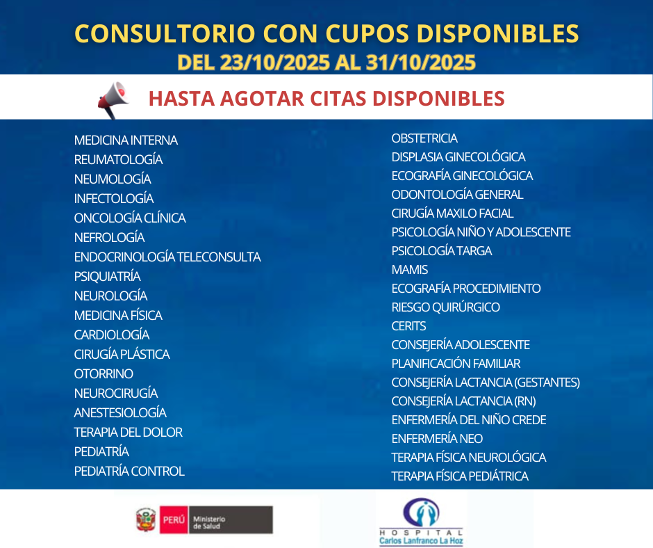 📢 Estimados usuarios le compartimos el listado actualizado de especialidades que tienen cupo para atención del 23 al 31 de octubre.