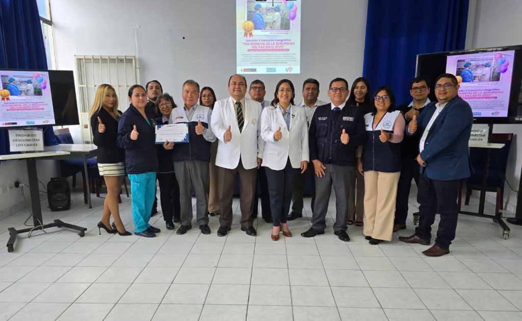 | La directora general de la Dirección de Redes Integradas de Salud (DIRIS) Lima Norte, Sheila Gisela Fabián Ortiz de Mateo, junto al jefe de la Oficina de Gestión de la Calidad, Dr. Willy Díaz Alva, visitaron las instalaciones del Hospital Carlos Lanfranco La Hoz (HCLLH) para hacer entrega del reconocimiento por haber obtenido el primer puesto en el II Concurso Fotográfico desarrollado en el marco del “Día Mundial de la Seguridad del Paciente 2025”. |