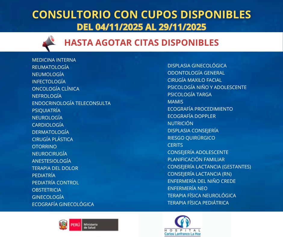 | 📢 Estimados usuarios le compartimos el listado actualizado de especialidades que tienen cupo para atención del 04 al 29 de noviembre. |