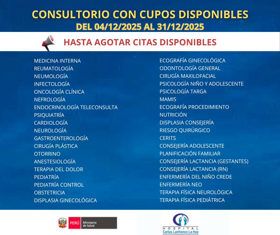 | 📢 Estimados usuarios le compartimos el listado actualizado de especialidades que tienen cupo para atención del 05 al 31 de diciembre. |