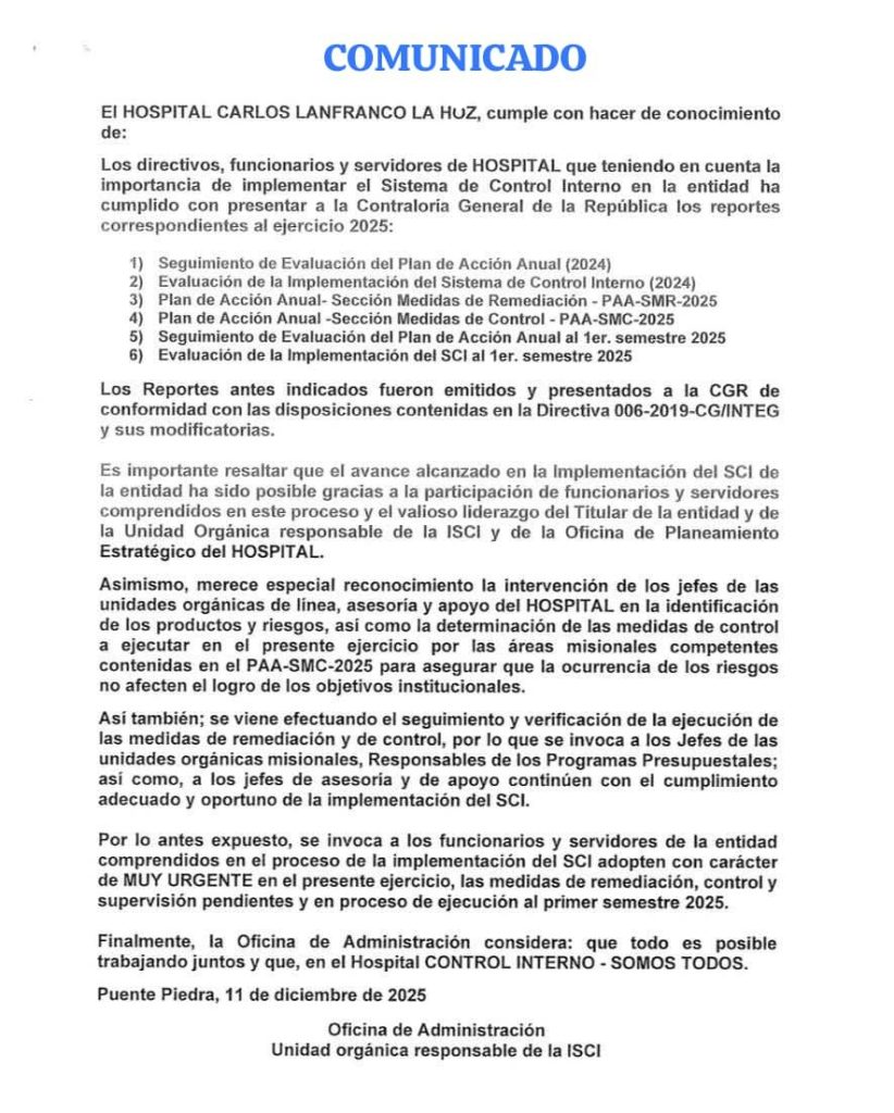 | ✅ El Hospital Carlos Lanfranco La Hoz, dirigido por el Dr. Luis Enrique Ríos Olivos, comunica sobre la Implementación del Sistema de Control Interno. |