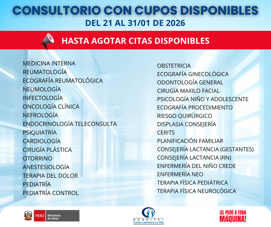 | 📢 Estimados usuarios le compartimos el listado actualizado de especialidades que tienen cupo para atención del 21 al 31 de enero del 2026. |