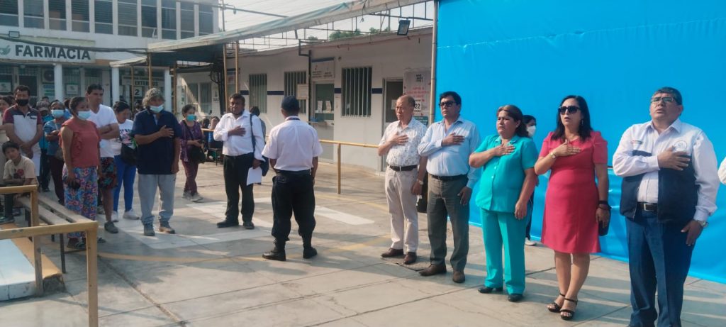 | 🇵🇪 Como cada lunes, el Hospital Carlos Lanfranco La Hoz, dirigido por el Dr. Luis Enrique Ríos Olivos, realizó la ceremonia de izamiento del Pabellón Nacional. |