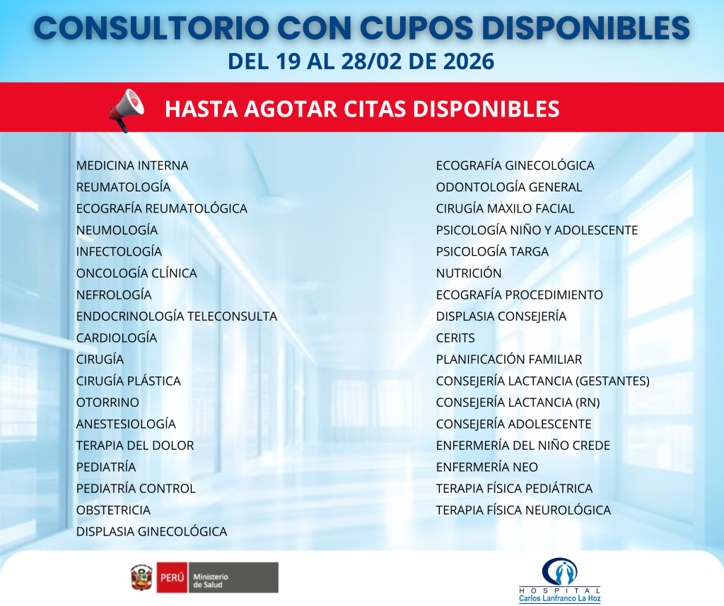 | 📢 Estimados usuarios le compartimos el listado actualizado de especialidades que tienen cupo para atención del 19 al 28 de febrero del 2026. |